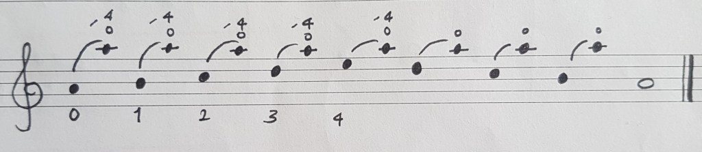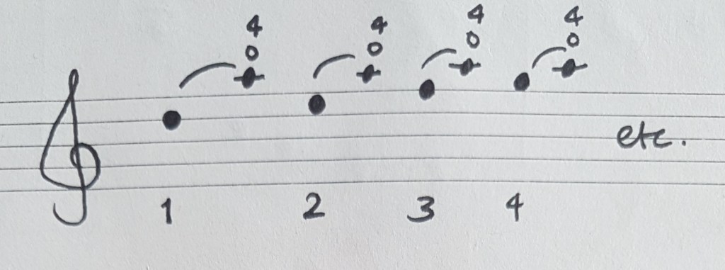 - Practice E by just playing the first 2 notes of each group of 4. Play them slowly and, again, make sure everything is as centred as possible before adding the octaves back in.