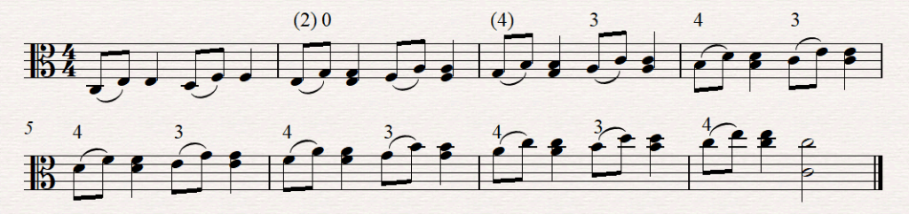 - For bars 3-5, try to adjust to each new pair of strings quickly, so that the string crossing angles for each beat are shallow. Practice any slurred notes that cross the string as double stops for intonation.